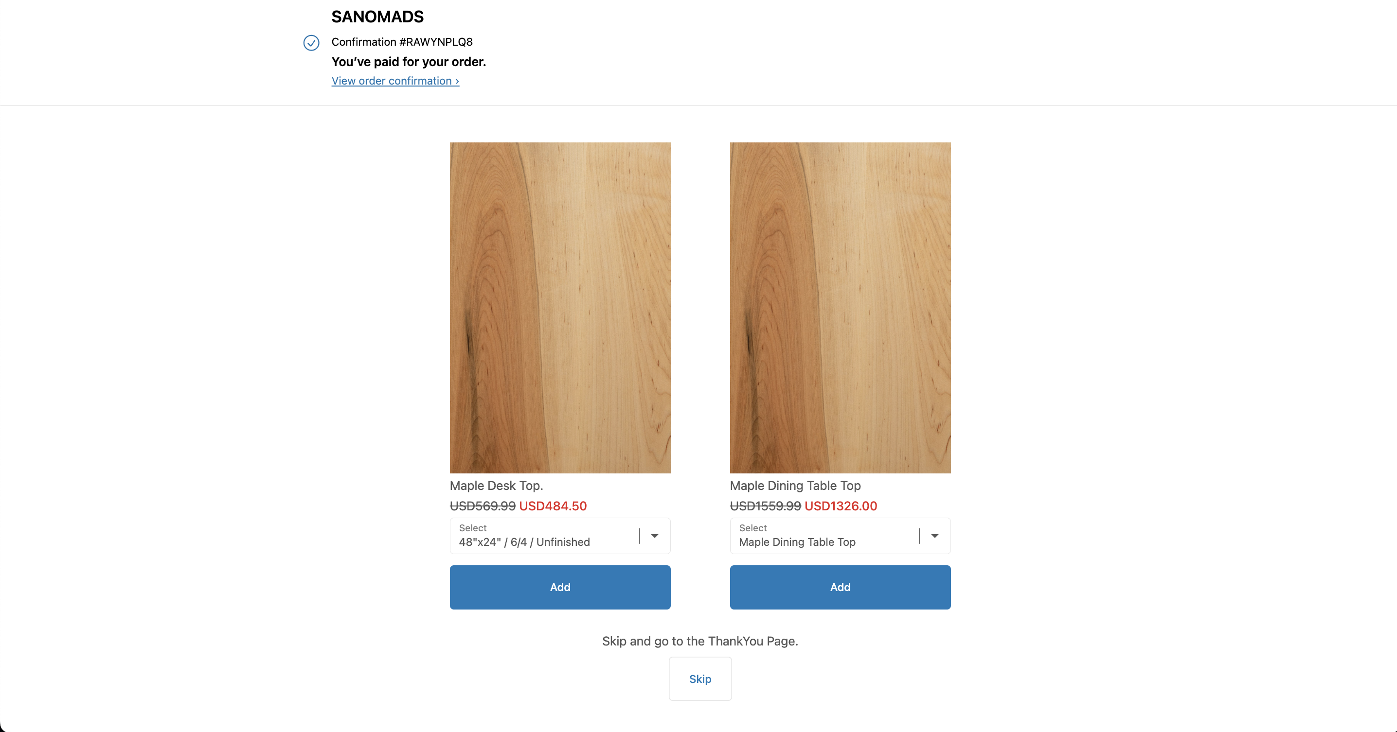 14. Create a new <mark style="color:green;">**Order**</mark> from your store and after a successful checkout, you will be able to see a post purchase page including the <mark style="color:green;">**static upsell**</mark> products offered at 15% discount.